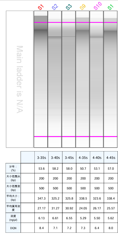 從上圖可看出:10分鐘的效果最佳,大部分在300-500 bp之間